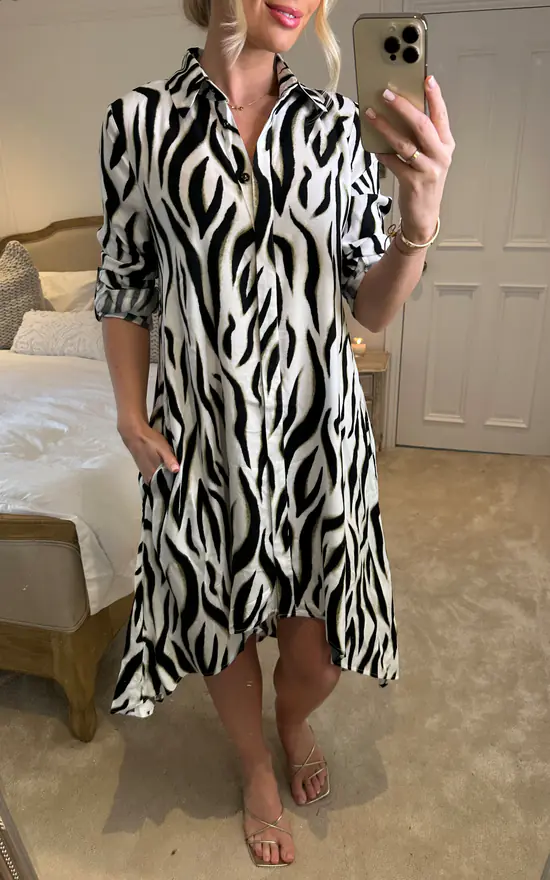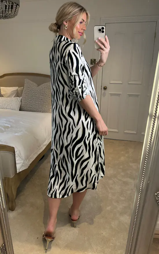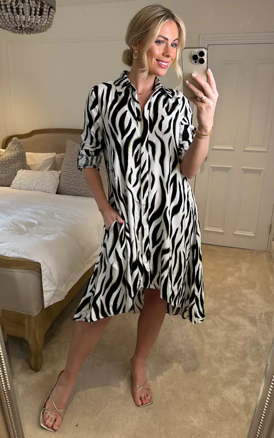 Zebra print is a classic style which will never go out of fashion. This flattering shirt dress features an oversized fit and asymmetric hem. A wearable style from day to night.