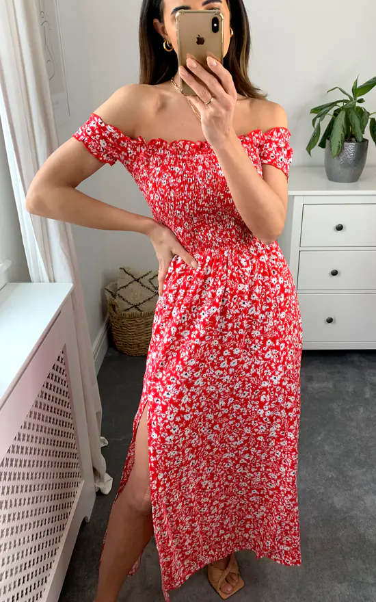 We love summer dresses, and this pretty maxi dress in a red and white floral print is one of our favourites this season. The bust is shirred to hug your silhouette and the straps fall into a lovely off shoulder design. We also love the deep split. Wear with gladiators on hot weekends’ BBQs.