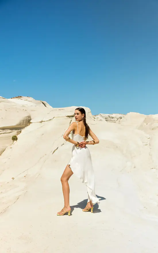 Modern minimalism. Designed with a cascading hem, striking ivory hue and silk-inspired fabrication to capture the raw beauty of a moonlit waterfall.