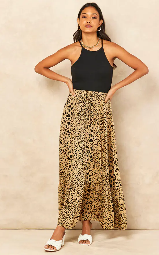 Effortless style made easy! This animal print maxi skirt is taking casual chic to a whole new level. Easily dressed up or down. Wear with heels and a black vest top.