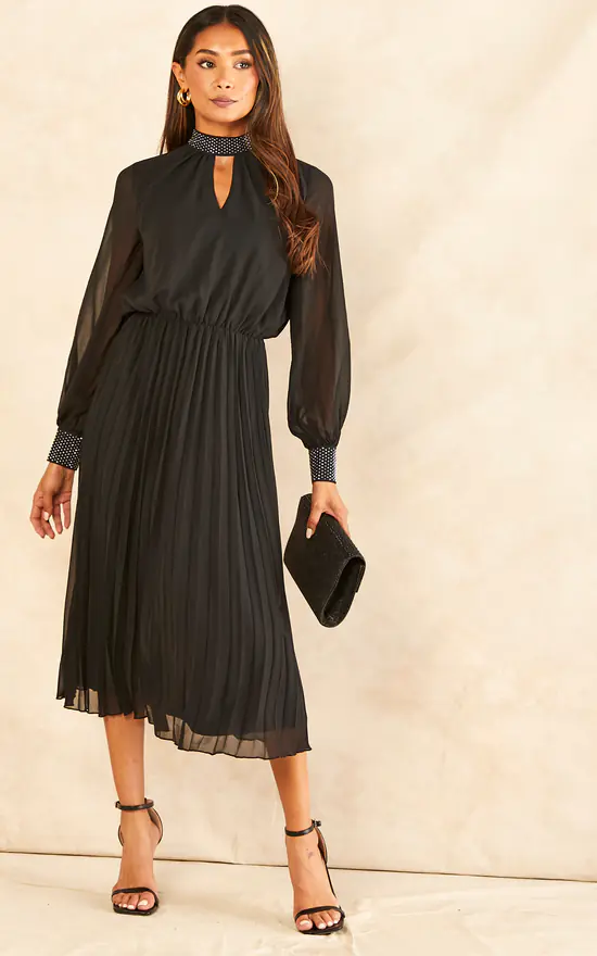 Go to a fancy dinner party with this midi dress. Featuring a collar and wrist diamond detail, a front keyhole and pleated design for that final elegant touch, this black dress with a mesh top layer will look wonderful when matched with black stilettos.