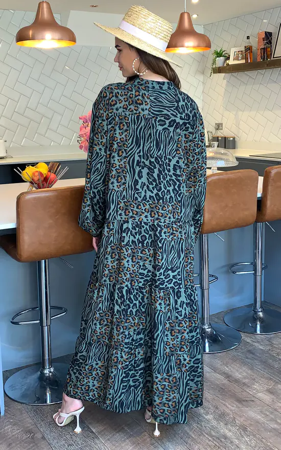 Exclusively by Blue Vanilla. An update of our famous Amelie Dress – but in a maxi length! The Mara Leopard Print Tiered Maxi Dress In Khaki is a sure thing for any event – pair with heels, or keep it casual in sandals.