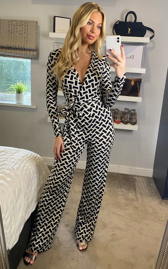 This wrap over jumpsuit comes in a geometric print with a tie at the waist.