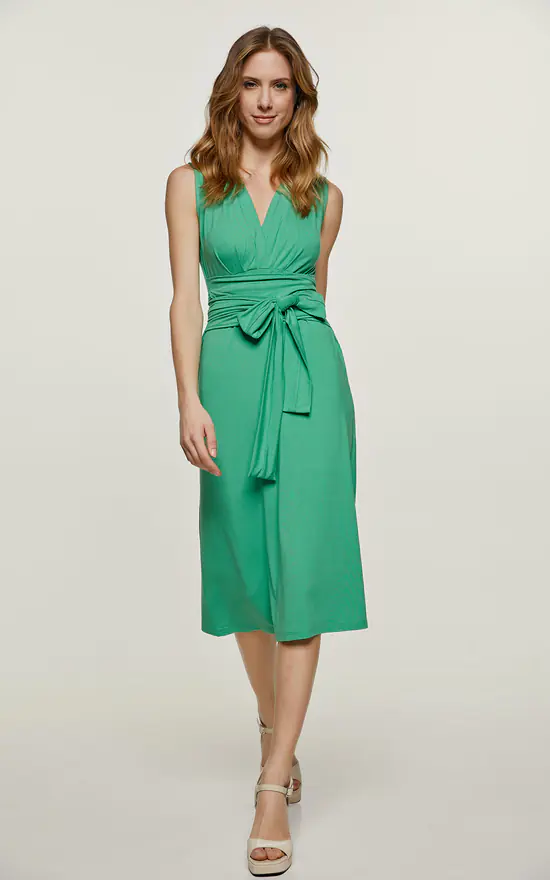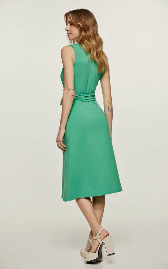 Summer dress in solid green colour stretch jersey fabric. Sleeveless with a deep V neckline with pleats on the left and right. Seam detail under the bust with pleats underneath. Belt in the same fabric fastened at the sides. Empire line with an A line silhouette. Knee length. Our model is 172cm and is wearing size 36/S. Measurements for size 36 (in cm): Shoulder -35; Chest-38; Waist-38; Bottom-47;Body length-101. 92%VISCOSE-8%ELASTANE