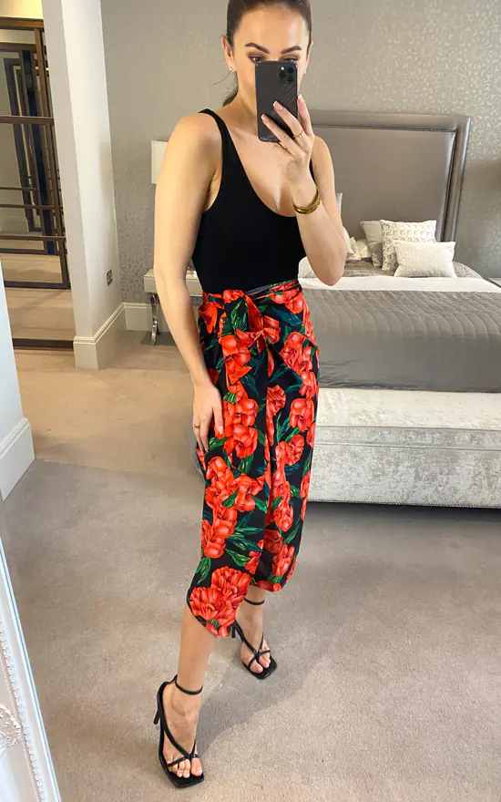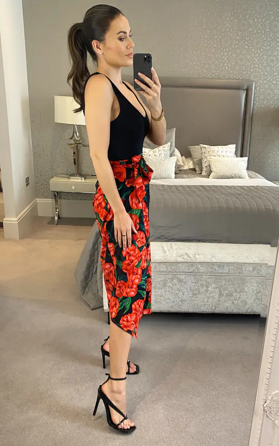 Feel fabulous in this striking bold floral with this wrap skirt in red and black. This floral print midi skirt is perfect for day to night occasions and parties this summer season. Pair this with wedges for the ultimate glam!