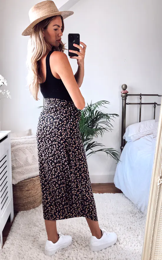 Simplicity with class! Featuring a wrap front, waist tie and easy to pair midi length, the all over adorable blush floral print and classic shape make it a year round essential no wardrobe should be without. It’s the Monday to Sunday staple that you’ll wear on repeat!