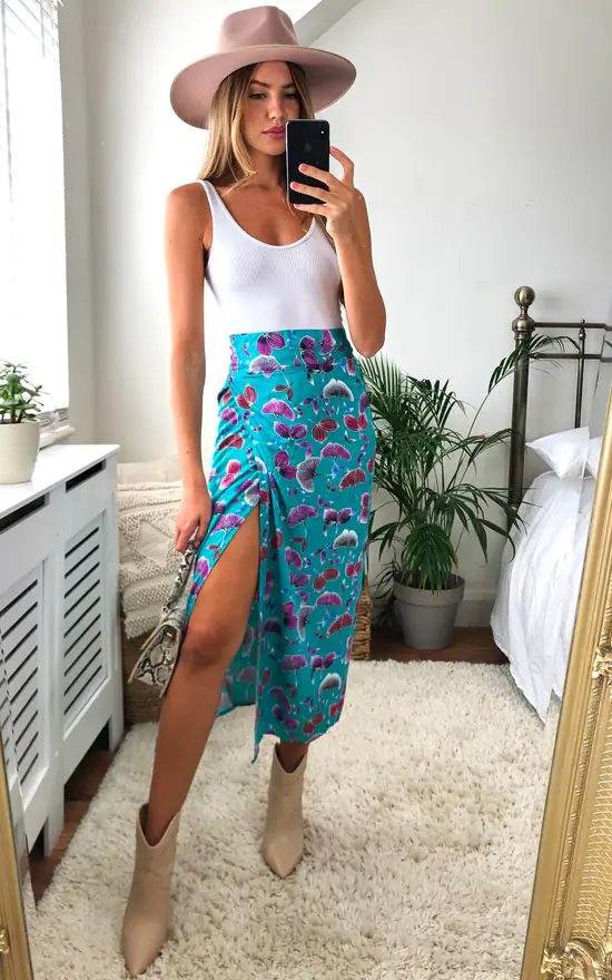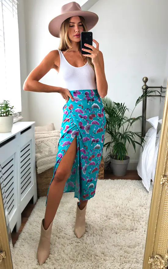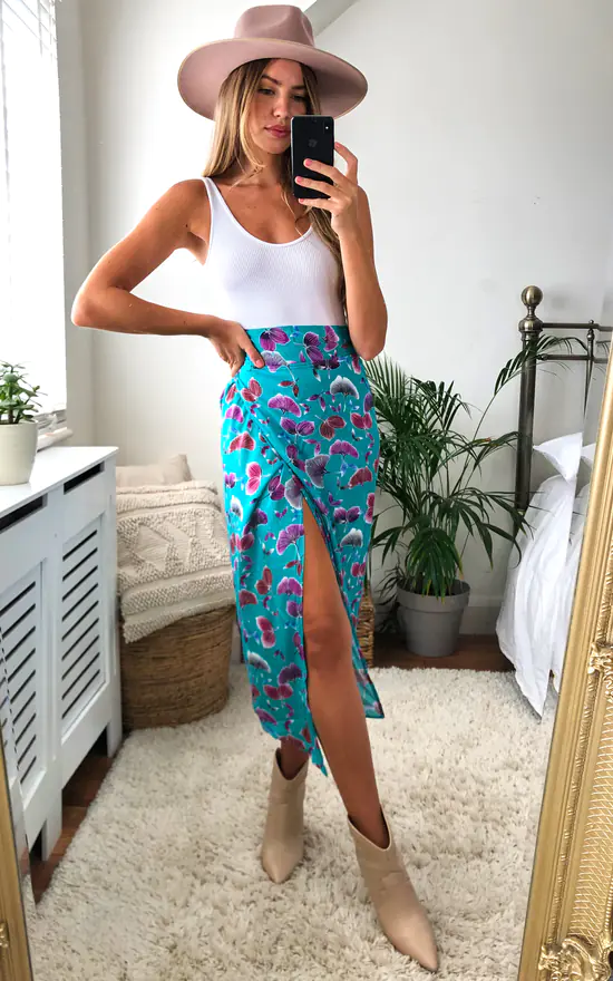 Everyone loves this adorable wrap midi skirt newly designed by D. Anna. This purple and turquoise wrap skirt is a convertible collection of day to night dresses occasions. Featuring a wrap front, cute print and midi length with a matching side tie, this skirt is an essential collection of this season’s wardrobe!