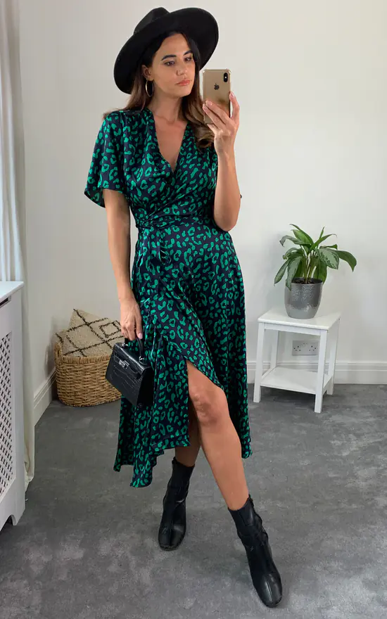 This is one of the ‘must have’ pieces for this season! Look totally chic in this green leopard print navy base. This v neck plunge neck wrap detailed drss is very figue flattering, with a tie belt and wrap front, this dress will give you a standout silhouette.