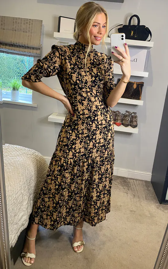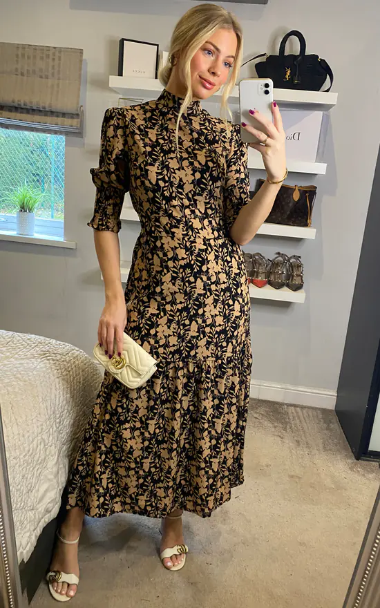 Look totally chic this season in this all over fabulous animal print midi dress newly designed by D. Anna. It has everything you want – a fabulous print, smocked 3/4 sleeves and high neck feminine silhouette – a perfect transitional piece for your wardrobe.