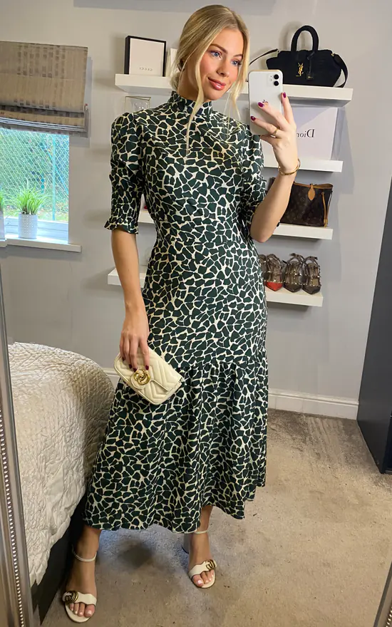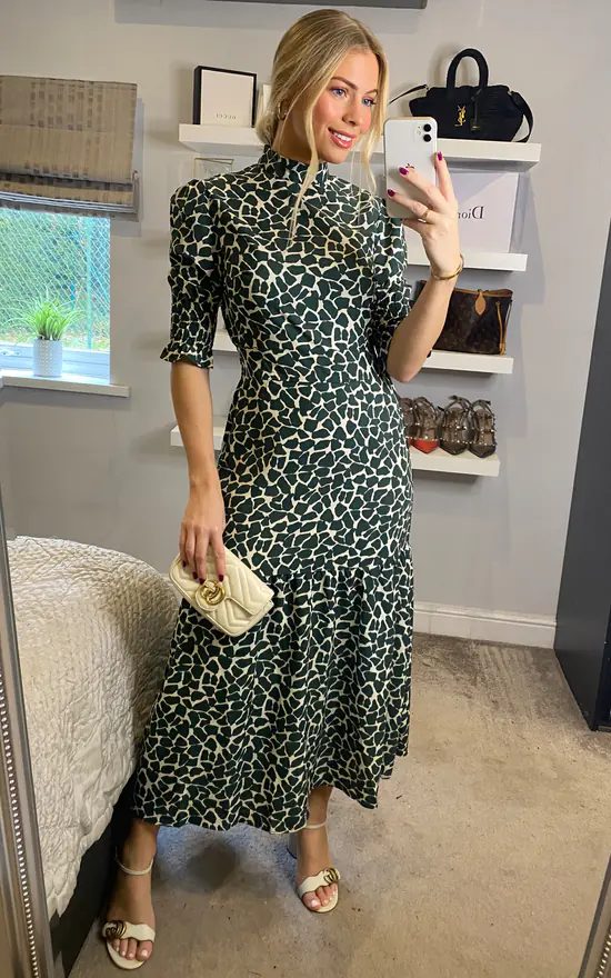Look totally chic this season in this striking animal print midi dress newly designed by D. Anna. It has everything you want – a fabulous print, smocked 3/4 sleeves and high neck feminine silhouette-a perfect transitional piece for your wardrobe.