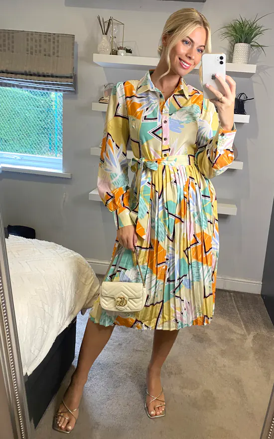 Every wardrobe needs a versatile shirt dress like this vibrant print shirt dress. With a shirt collar, a button front, long sleeves, a belt fastening around the waist and a midi length with pleat details, this shirt dress is a perfect choice for work, drinks with friends or evening outs.