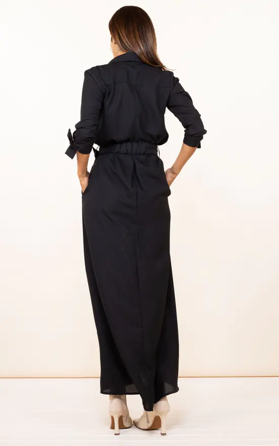 Make your fashion dreams come true in this elegant maxi shirt dress. Featuring slim-fitting sleeves with tie-cuffs and an attached buckle belt. Perfect for fancy and casual occasions, it’s the ultimate versatile maxi!