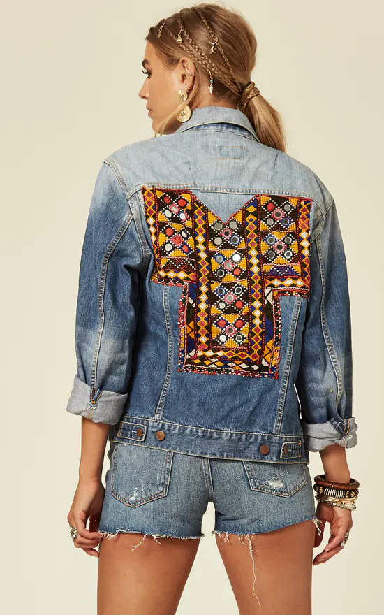 A hand picked, vintage Levis jacket that has been lighted, softened and distressed, then embroidered on the back and embellished with recycled Indian jewels.