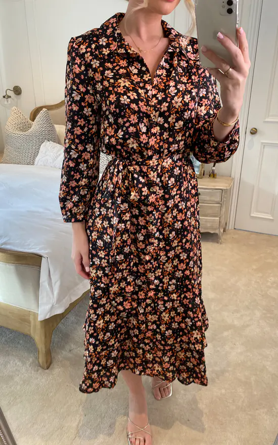 Shirt dress with tiered ruffle hem button down front and blouson sleeve with a self tie waist. Comes in 2 different prints- floral print and leopard print