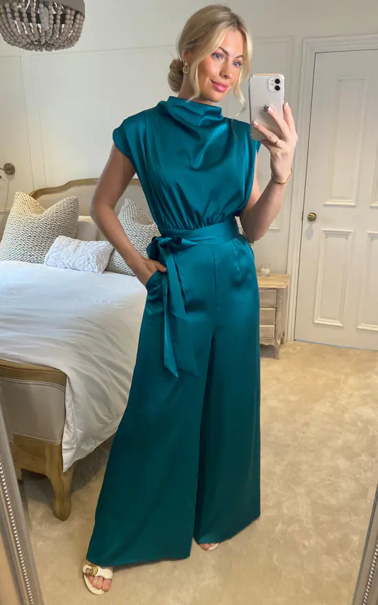 Satin high neck sleeveless jumpsuit in abstract print, pleated detail on the shoulder and a self tie to cinch in the waist. Also available in a print version