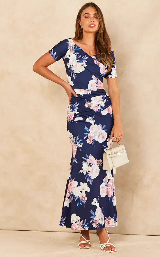 From Feverfish a maxi dress with Bardot off shoulder neckline and short sleeves ,featuring a ruched waist and pleating at hem,made in printed scuba crepe fabric this design is perfect for occasions.