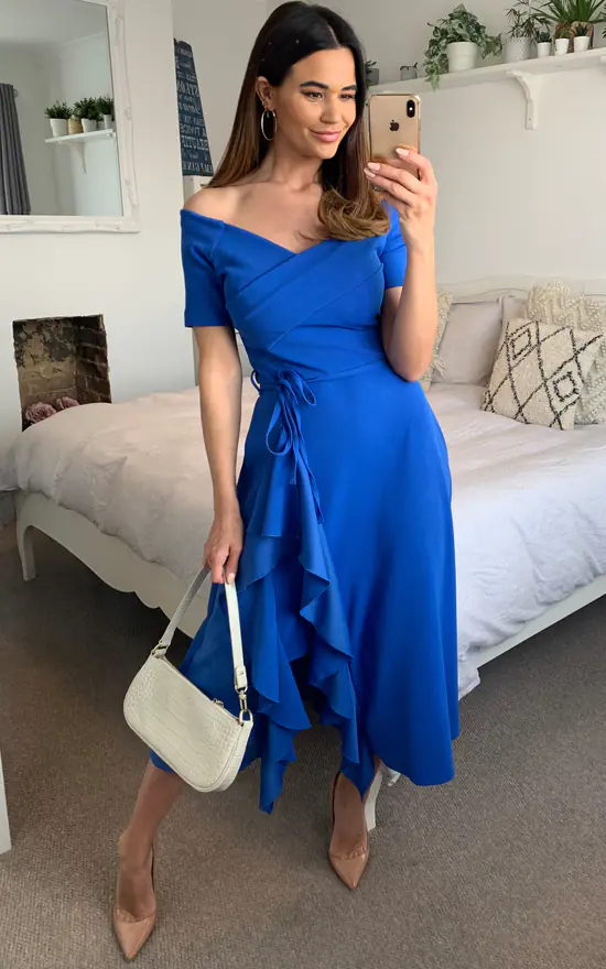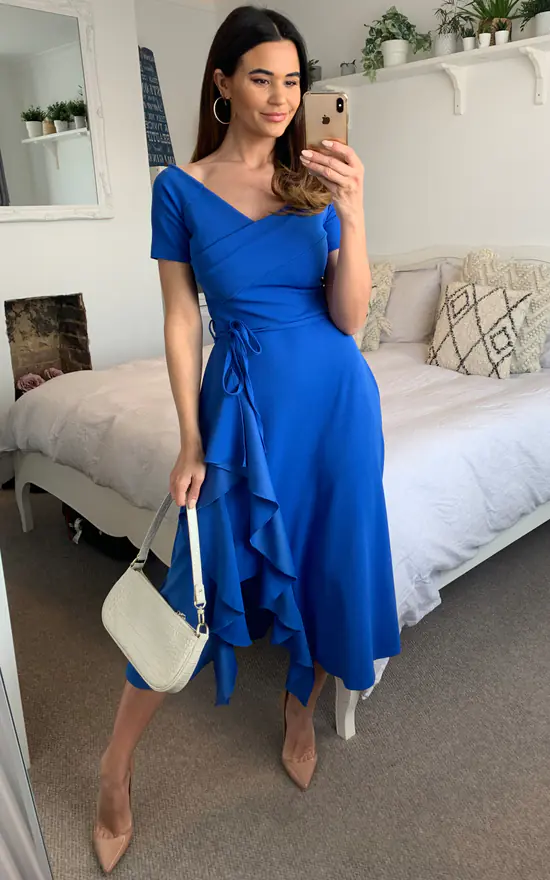 Bardot off shoulder midi dress from Feverfish in a gorgeous royal blue. This design has a flattering off-shoulder neckline with an asymmetric frill detail skirt and a tie belt at waist. This chic design is perfect for a formal occasion and is made in stretch scuba crepe fabric.
