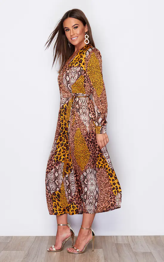Be talk of the town in this wrap animal print midaxi dress! Featuring long sleeves, and a tie waist detailing. Pair with boots and a leather jacket for autumn/winter casual glam.