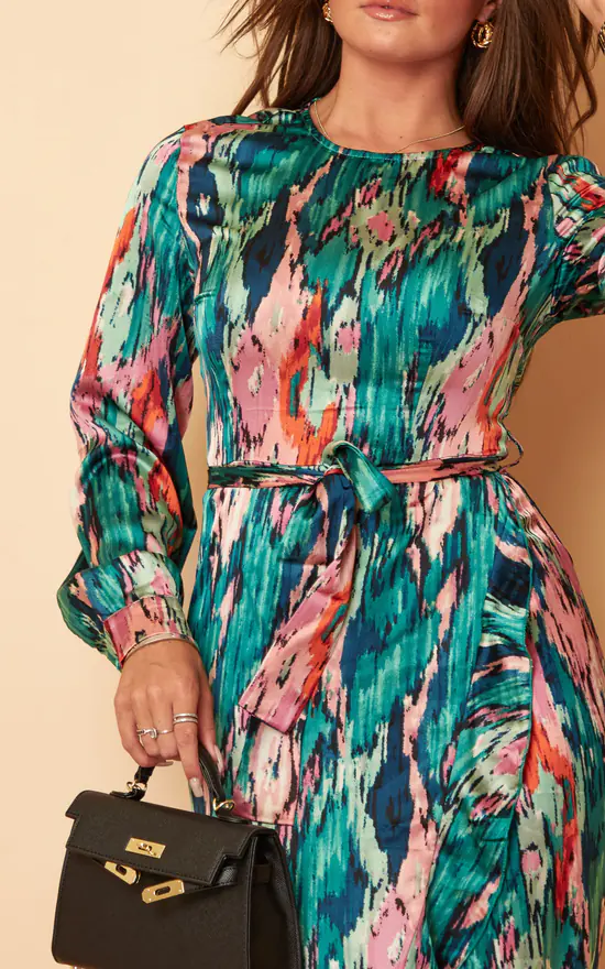 Take on the season with our beautiful Danica Teal & Pink Tie Dye Frill Skirt Long Sleeve Midi Dress. Crafted with our premium satin fabric, this statement dress features a delicate feminine frill along the wrap over skirt, long sleeves and a belt to create the perfect silhouette. Make an entrance to your next evening party or cocktail with the girls with this eye catching midi, a glossy style that will cover all your plans this season! Pair with heels and your favourite handbag to complete the look.