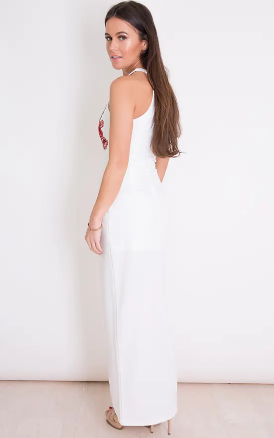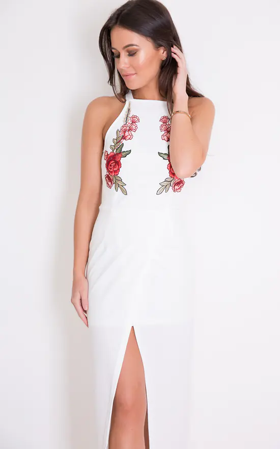 We are obsessed with this maxi dress this season. Featuring floral appliques and a wrap skirt, this dress is a must have!
