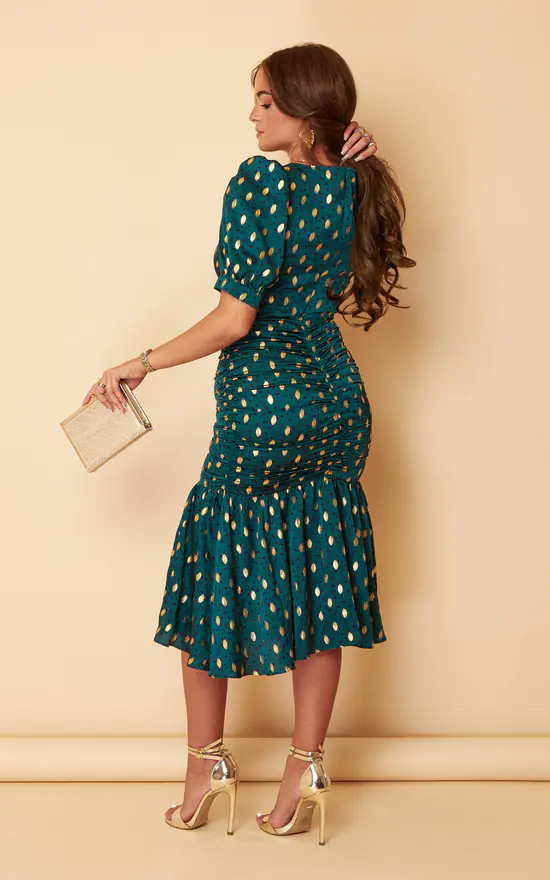 This stylish Nylah Emerald With Gold Foil Puff Sleeve Ruching Detail Midi Dress is a must-have in your wardrobe! Featuring ruche side and back detailing, puff sleeves, a wrap over top and a super flattering stretchy material this dress will make you look elegant on any occasion! Pair with silver or gold accessories depending on your preference and feel confident on your girl’s night out.