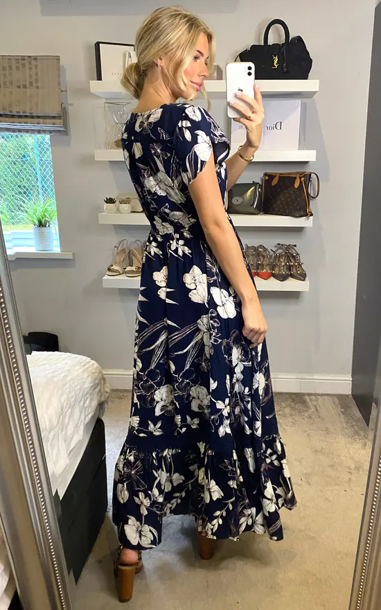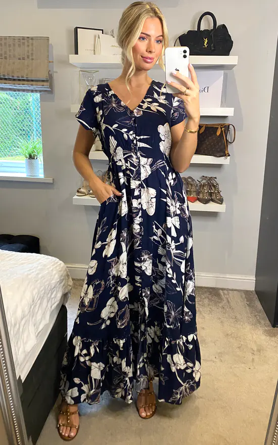 Every closet needs a statement printed dress like this tropical print maxi dress. With a V-neck, a button front, cap angel sleeves, side pockets and a tiered full length maxi skirt with a crochet insert trim. Pair with nude heels for a polished daytime look to take you from a wedding to the beach.