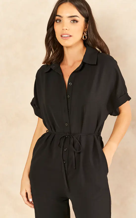 Stylish Black Jumpsuit with wide trousers. Decorated with Buttons and Shirt neckline. Has pockets for comfy fitting. Fixed with slim belt on the waist.