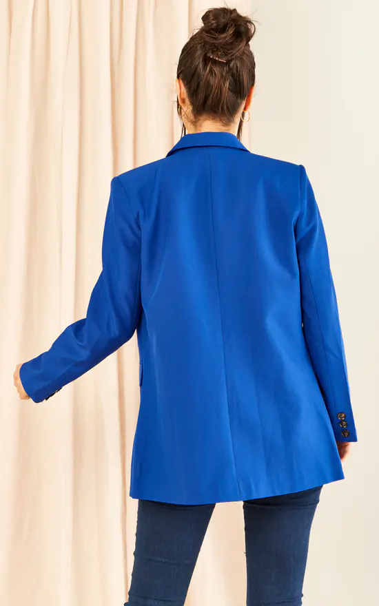 Oversized Double Breased Longline Blazer/Jacket in Sax Blue colour with 4 buttons and Peak lapel. Decorated with 2 side envelope pockets.