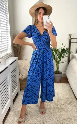 TENKI LONDON Ruffle Sleeve Polka Dot Wrap Romper Playsuit In Blue