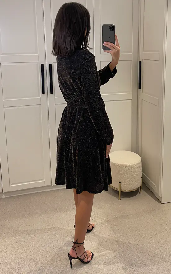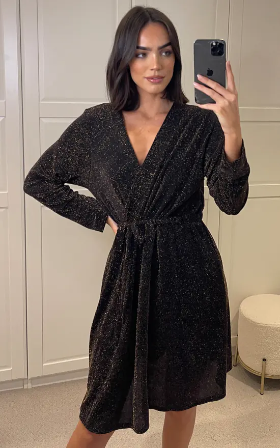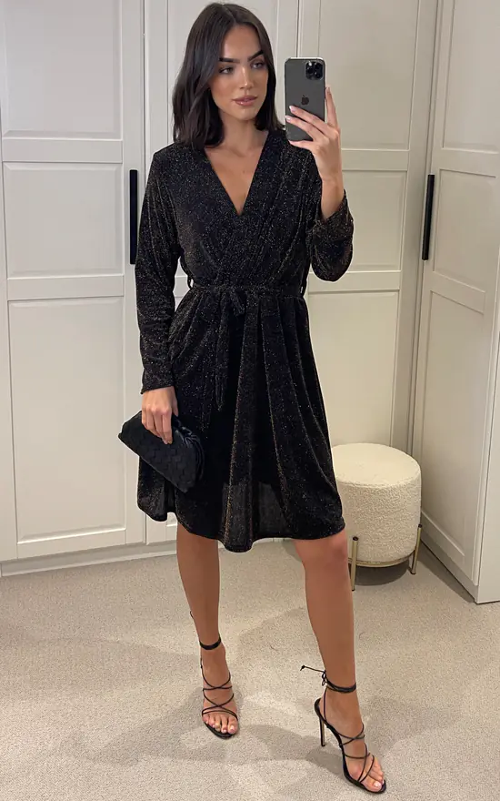 Stunning new party arrivals! A gorgeous dress perfect for going out, Christmas parties and fancy events. Crafted from soft, shimmer lurex material and features elasticated waist for extra stretch and comfort. Has a belt tie, crossover v neck and pleated bottom for a flattering fit. Fully lined. A statement addition to your wardrobe.