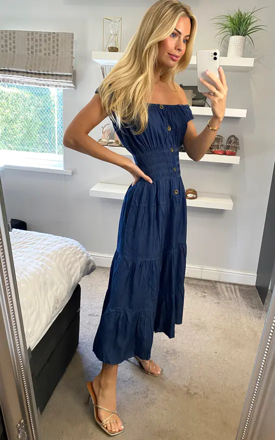 A gorgeous addition to your spring/summer wardrobe. Our stunning plain denim midi dress is sleeveless and features rouched full elasticated waist and faux button detail. Can be worn off or on the shoulder. Team with trainers or wedges for desired look. Crafted from soft cotton and elastane for extra comfort and flattering fit for all body shapes.