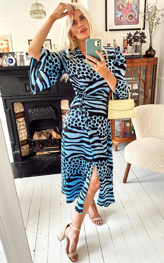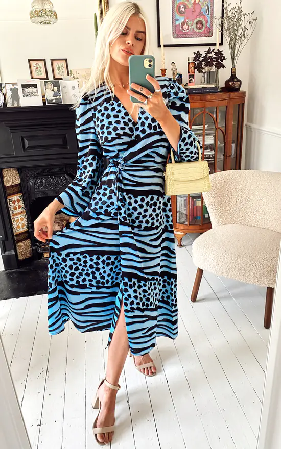 A 3/4 kimono sleeve midi wrap dress in a light blue base with the animal print in black a darker blue