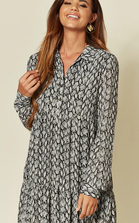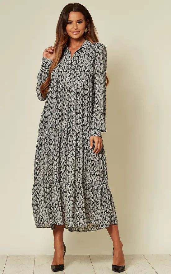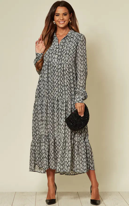This maxi dress is made from chiffon and has a lined body. This style has a tiered skirt that’ll layer well over chunky sneakers or boots. It has slightly puffy long sleeves. Team yours with pumps and a beaded clutch for garden parties and weddings this summer.