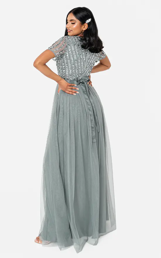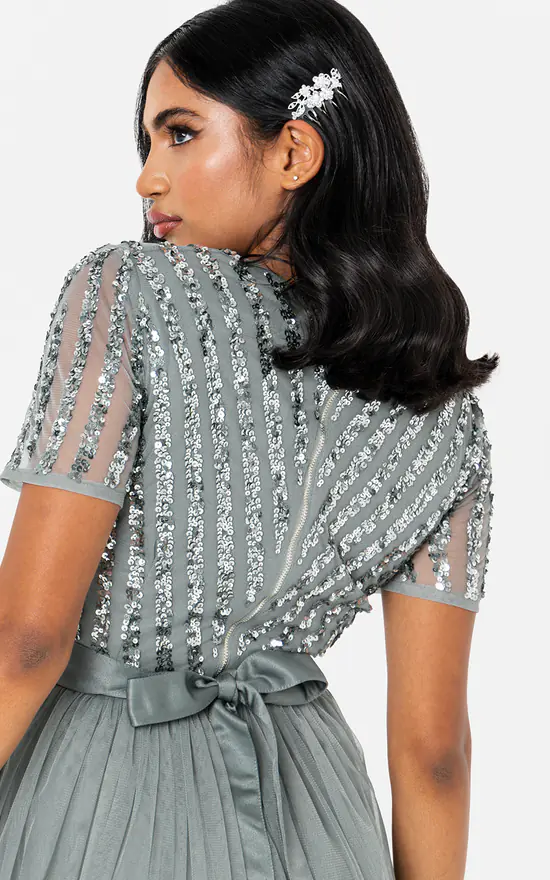 With an elegant twist on the most popular style of our Maxi dresses, this Misty Green shade works perfectly with the stripy green and silver sequin embellishment that follows the V neckline and contrasting angles on short sheer sleeves. Delicate tulle overlay gathered at the waist creates a free-flowing shape perfect for a dancing queen. To make the look complete a removable satin waist band can be tied in a lovely bow at the front or back for that little extra detail.
