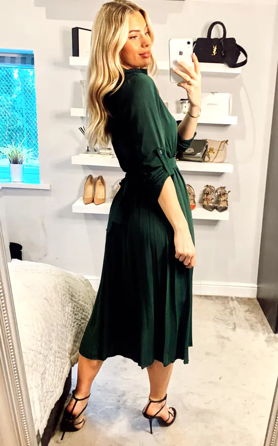 Imagined with a classic shirt shape, this midi Green dress from Mela offers a subtle formal update. Adding a touch of sophistication with the gold-tone belt, it features gentle pleats running from the waist to the hemline. The classic shirting collar is maintained for maximum impact.
