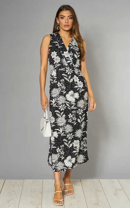 Tone down your new look with this monochrome midi dress. Designed with a sleek floral print, it’s been updated with spots, a crossover design and a slinky tie running around the waist. The soft fabric and sleeveless style make it a comfortable choice, with a zip on the back bringing it to the perfect close.