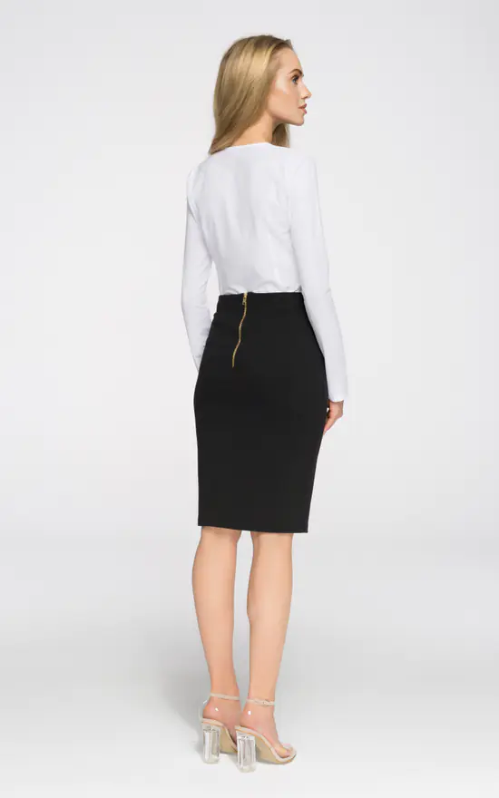 Stretch knit, plain pencil skirt with an exposed, back zip. Unlined.