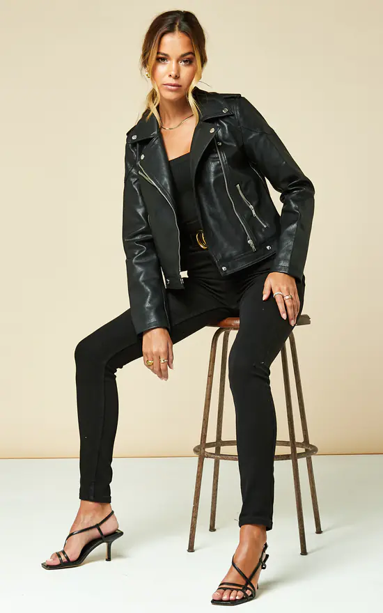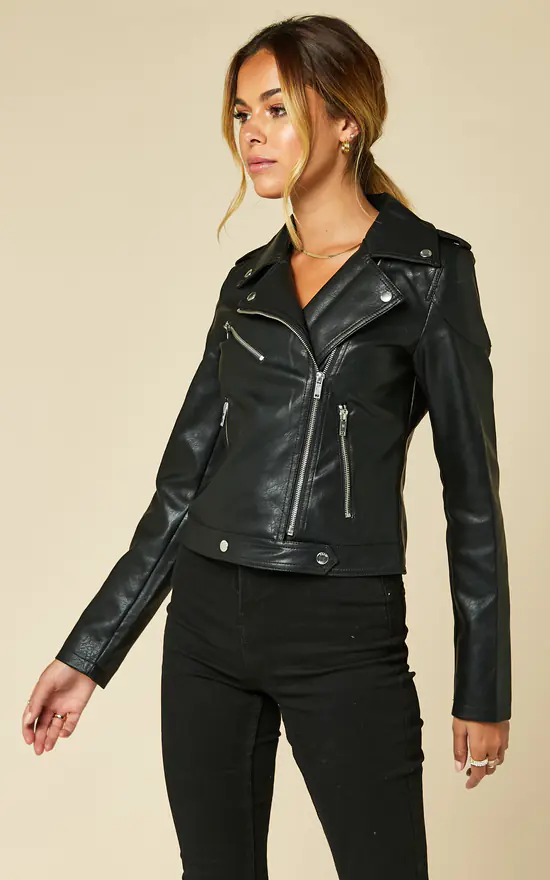 A true wardrobe hero, this leather look biker jacket oozes effortless chic.