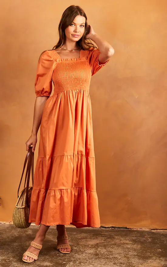 Dusty Orange Bella floaty midi dress with Balloon Sleeves. Fresh and breezy the Bella dress is the most romantic dress around. Featuring shirred details and hugging neckline, this maxi can be worn off the shoulder or with the cute balloon sleeves up.