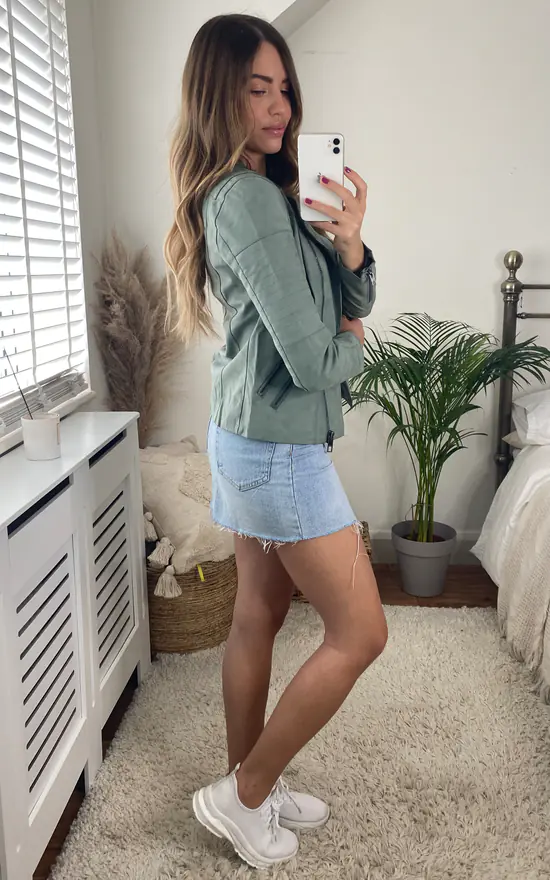 Taking outerwear to a whole new level – this green biker jacket is chic, stylish and perfect for everyday wear.