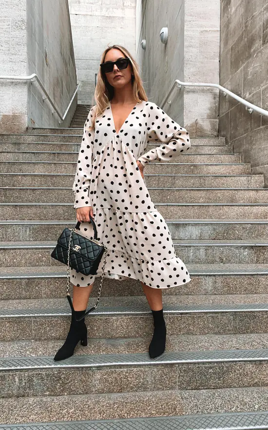 The Dotty day dress is cut from a woven polka dot print. Designed with under bust detailing, subtle balloon sleeves, tiered midi skirt and cuffs with button detailing. This dress will become a staple in your wardrobe and can be worn to work, lunch with friends and much more. Style yours with black heeled boots to take you from day to evening.
