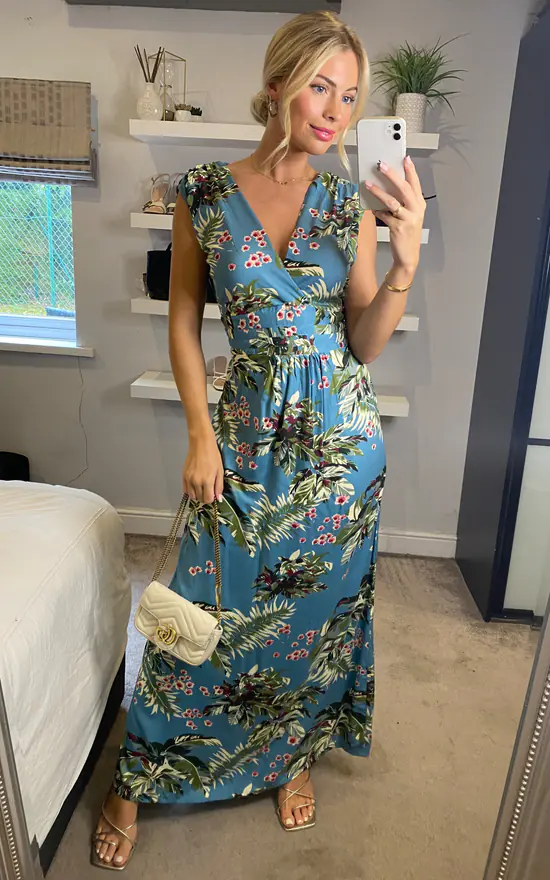 Lovely on trend blue tropical print maxi dress with deep V front and back wrap detail. Empire line, nipped in waist and back shirring elastic detail give a very flattering fit. Great must have dress for the season.