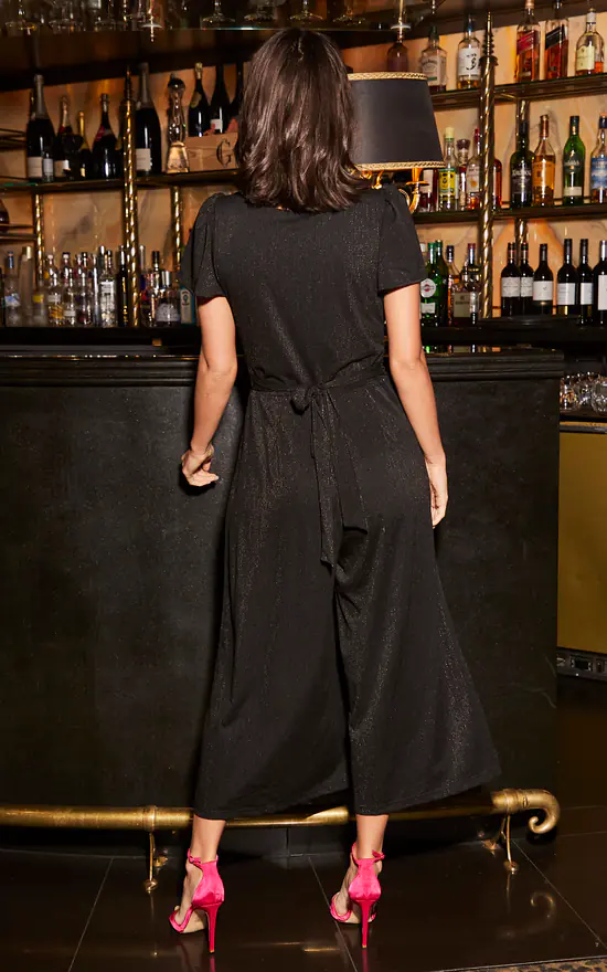 A classic black sequin glitter jumpsuit with angel sleeves with a touch of festive glamour. This black glitter jumpsuit is perfect for a Christmas party, night out or formal event. Pair with heels and one of our genuine Italian leather handbags to complete the look. Stylish, sexy and flattering, this jumpsuit is a must have this party season.