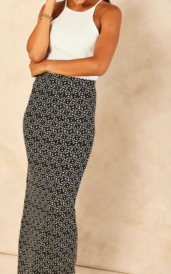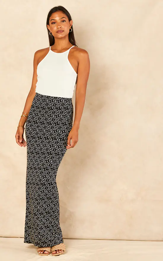 Printed Maxi Skirts, Random Black and White spots Maxi Skirt with elasticated Waist, a Maxi Tube Skirt Style, a perfect skirt for a holiday and beach wear. The Skirt can be worn with black or white top.