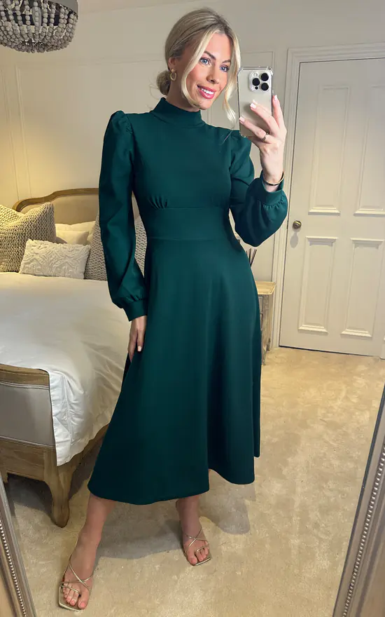 Beautiful long sleeve keyhole midi mermaid dress in emerald green, Perfect for party, office or casual drinks with friends. Wear it with your favourite high heels, matching accessories and look elegant at any place.