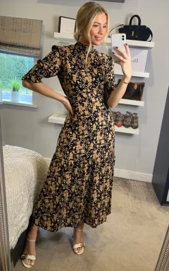 D.Anna Blush And White Floral Print Tiered Dress With High Neck And 3/4 Smocked Sleeves In Black
