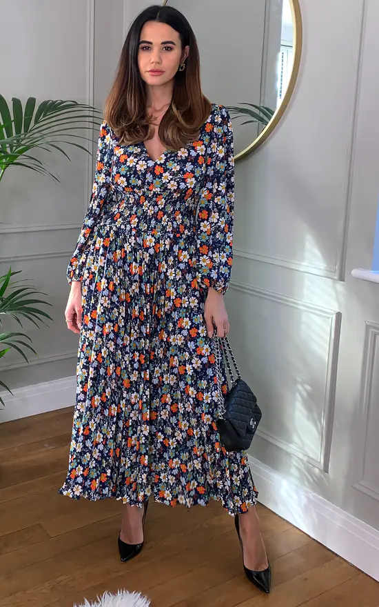 Our best selling Aurora dress is back in this cute navy floral print. effortless shaped it is worked with a V-neck, full length sleeves and cinching elasticwaist before falling to a breezy calf-length hem. 100% Polyester.