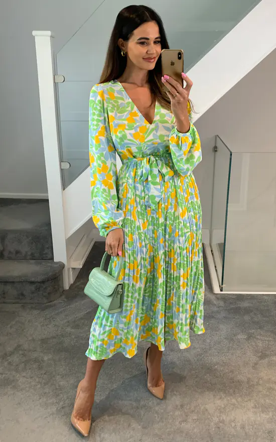 Harness laid back femininity in the Feels Like Summer Fathomless Dress. An effortless long-sleeved silhouette that falls from the V-neck bust to a pleated calf grazing hem. Side zip and belt. 100% polyester.