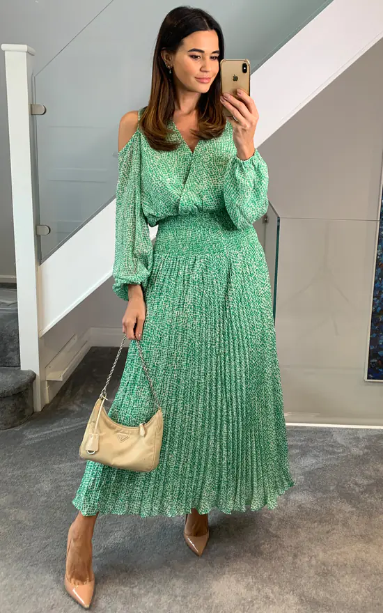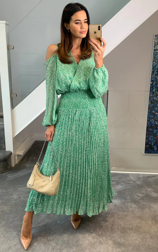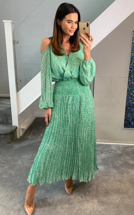 The Requim Dress captures a blend of modern elegance and vintage appeal. Crafted from lustrous chiffon, this open shoulder style is cut to a midi length and splashed in a dreamy dobby print making it easy to transition from day to evening. 100% Polyester.