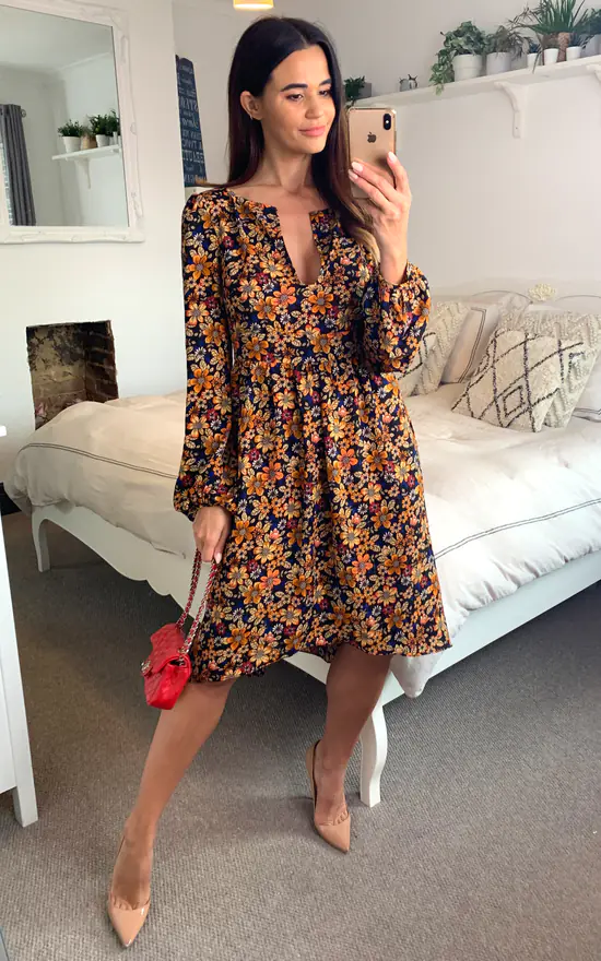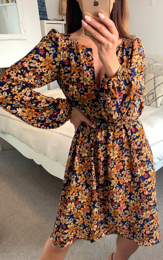 Channel the rust and brown autumn hues with the Tresspass midi dress. Made from an array of gentle florals, its midi profile is cleanly cut with a v-neckline collar, long sleeves, and a fabric waist belt.